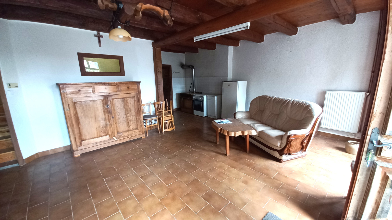 - En rez de chaussée on trouve une grande pièce à vivre ainsi qu'une cuisine ouverte, un cellier, une salle de bain, un WC et une chaufferie/buanderie.